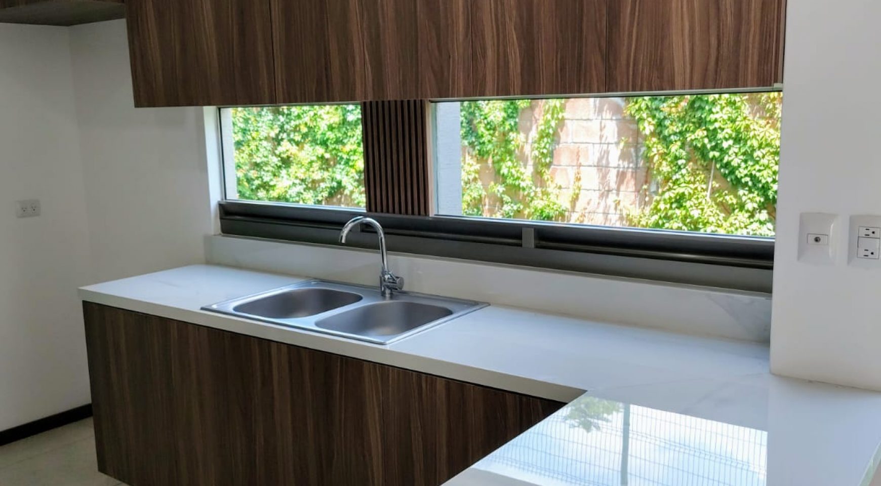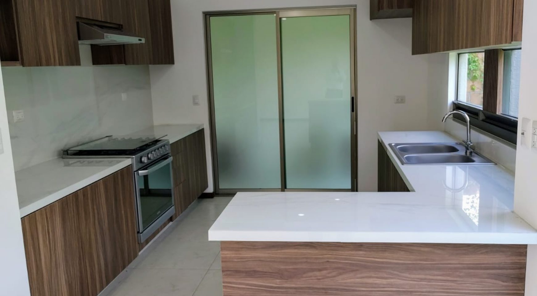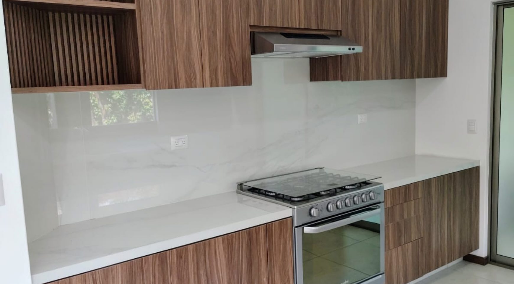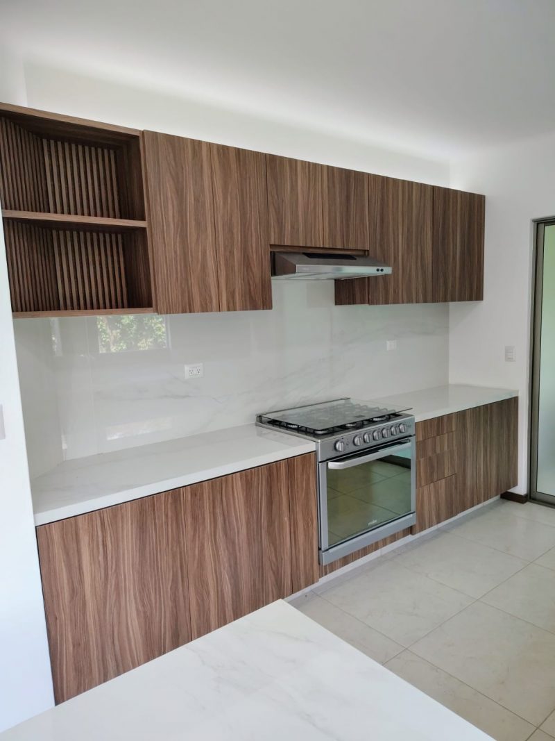 • Cocina integral con barra desayunador con cubierta de porcelanato